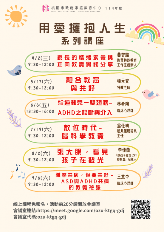 二、 | 旨揭課程詳細資訊,請見中心課程行事曆(https://reurl.cc/xlGyGL)或追蹤「桃園市政府家庭教育中心」FB粉絲專頁;另倘有家庭教育個別化服務需求,可撥打4128185家庭教育諮詢專線,本市市民可申請小桃家線上諮詢室(預約連結:https://reurl.cc/oZWOY5),由中心媒合專業人員透過線上會議室提供服務。 |