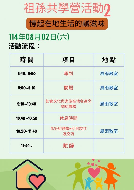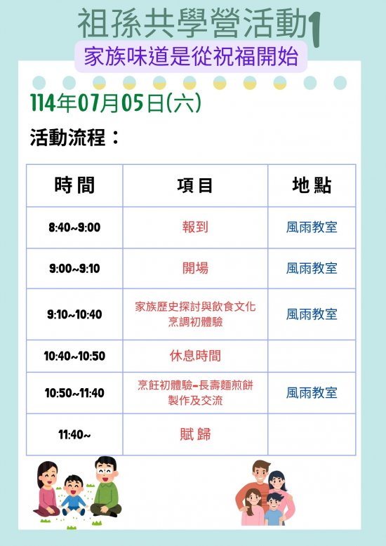 主旨: | 本校於114年7月5日(六)及8月2日(六)舉辦「暑期祖孫共學營活動」,敬請協助公告並鼓勵貴校師生、家長踴躍參加,請查照。 |