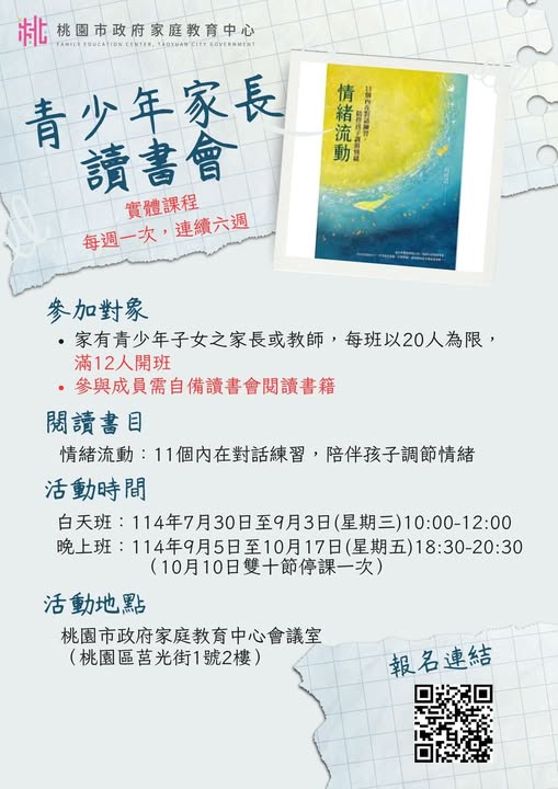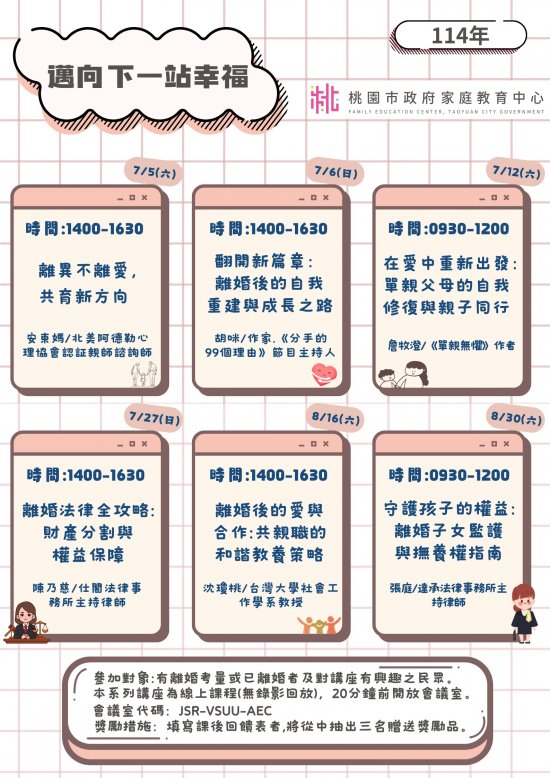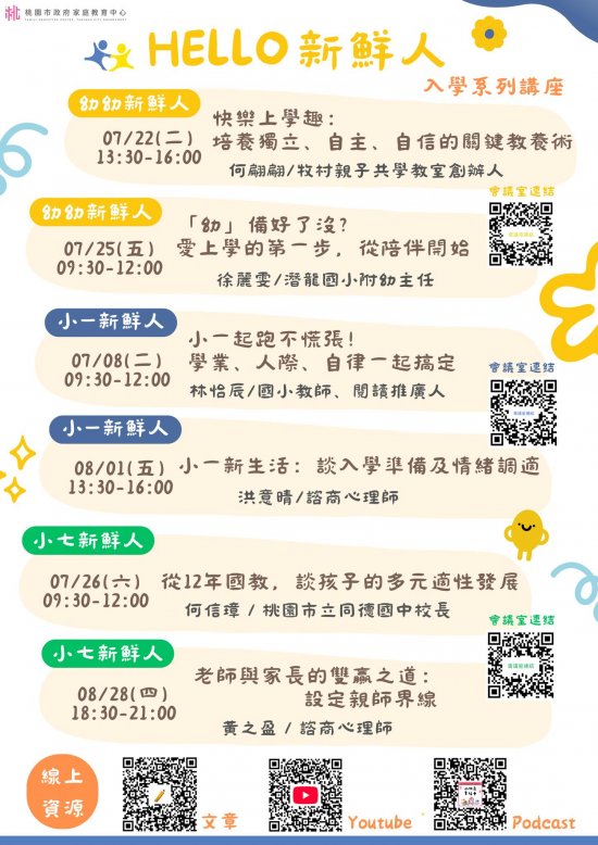 檢送本中心「小桃家7月課程資訊」、「HELLO新鮮人」、「青少年家長讀書會」、「邁向下一站幸福」、「當爸媽的二三事」海報各1份,惠請貴機關(學校)運用多元管道宣導,請查照。 |