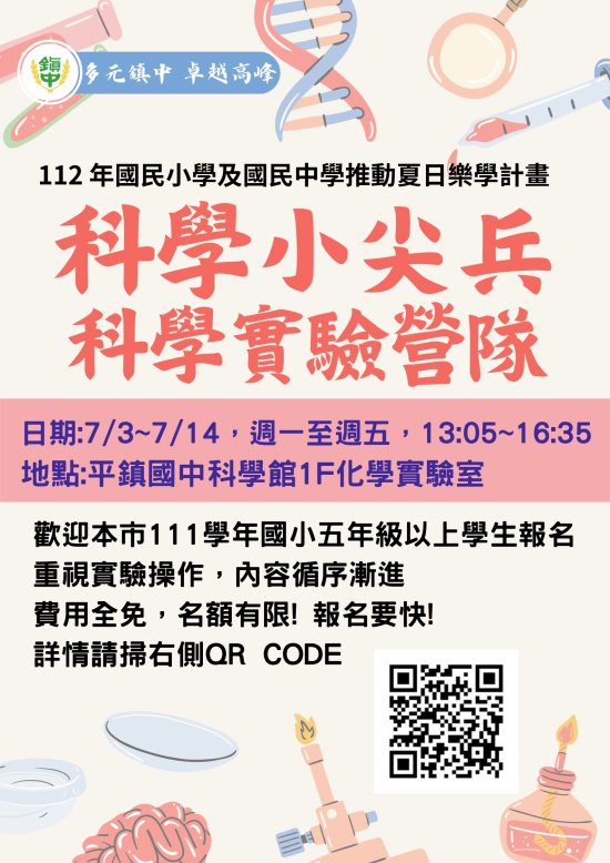 有關本校(平鎮國中)辦理科學實驗營隊~科學小尖兵一案,敬請協助公告周知,活動辦法詳如說明,請查照。
