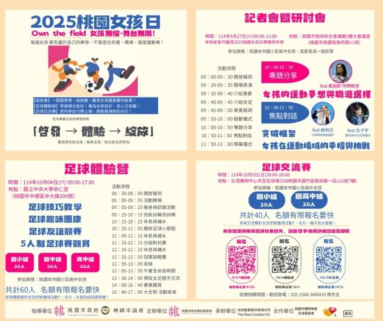 說明: 一、為響應聯合國訂定10月11日為「女孩日」重視女孩投資與 培力精神,今(114)年本局將延續深受好評的「運動性別平 權」主軸,鼓勵嘗試更多元的運動項目,強化社會對女孩 培力之認識與支持,並促進其健康發展與自信展現,辦理 活動如下: (一)「女性運動議題研討會」 1、時間:114/9/27(六)9:00-12:00 2、地點:桃園市政府綜合會議廳(桃園市桃園區縣府路 11號二樓) 3、對象:國小至高中職女孩及其家長、一般民眾參加。 (二)「女孩足球體驗營」 1、時間:114/10/4(六)8:30-17:00